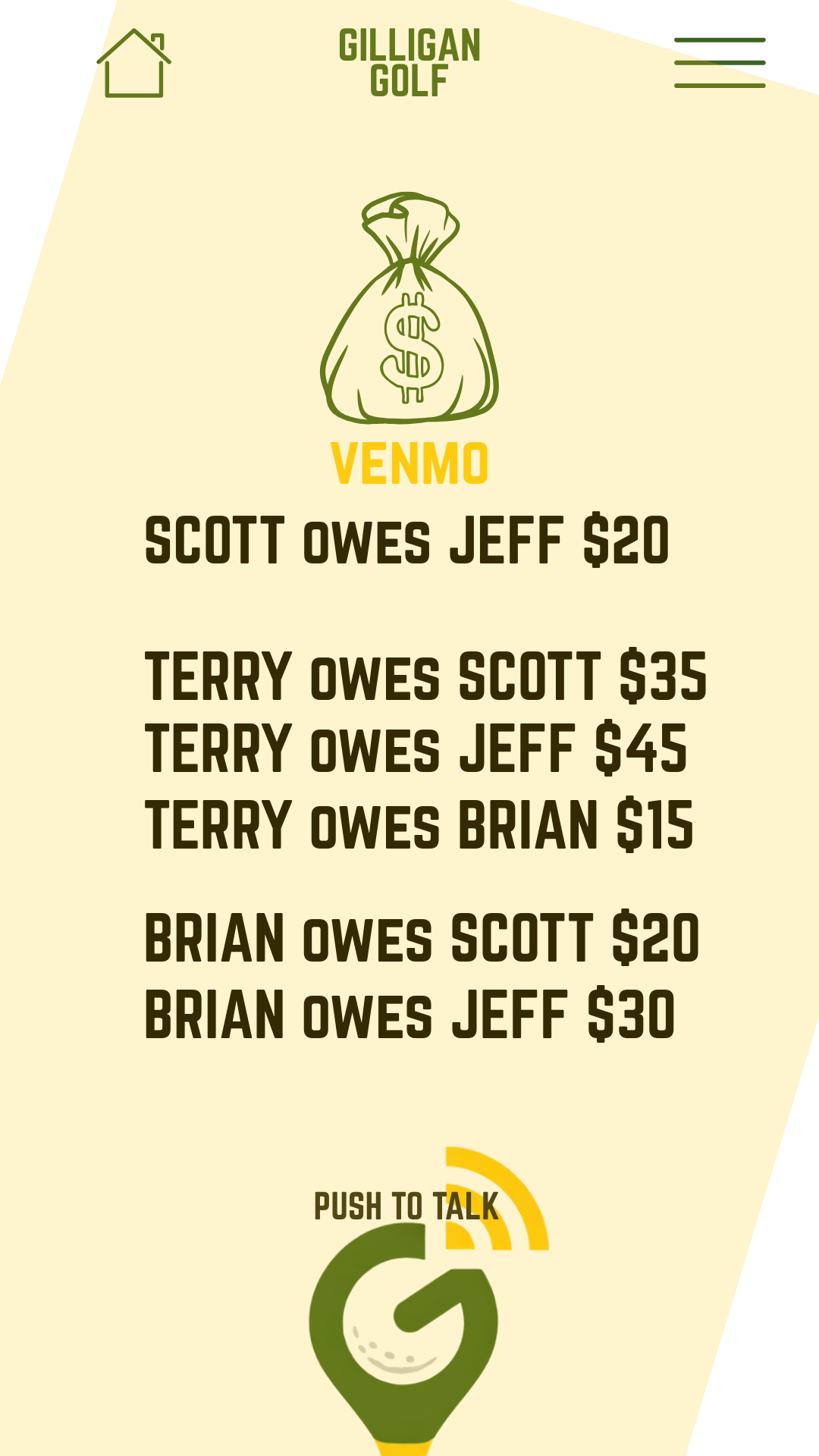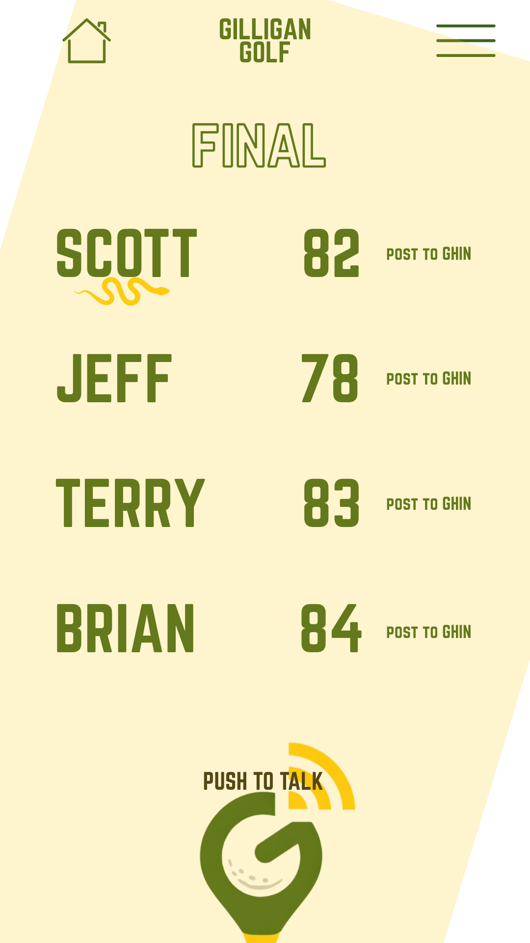 IMAGINE A virtual caddy & bookie that can keep track of everything. So you don’t have to look at a scorecard or your phone.You just talk to it. it understands everything about golf. I mean everything. GILLIGAN tracks all your shots with intuitive GPS.HEY GILLIGAN,“I’ve got 163, going with an 8 iron.”So after the round you can geek out to stats on your phone. Your buddy can’t join? They can follow along in real time and place bets. hey gilligan, “$20 says Jeff misses the fairway.” GILLIGAN even provides broadcast worthy set ups and recaps, Just ask.